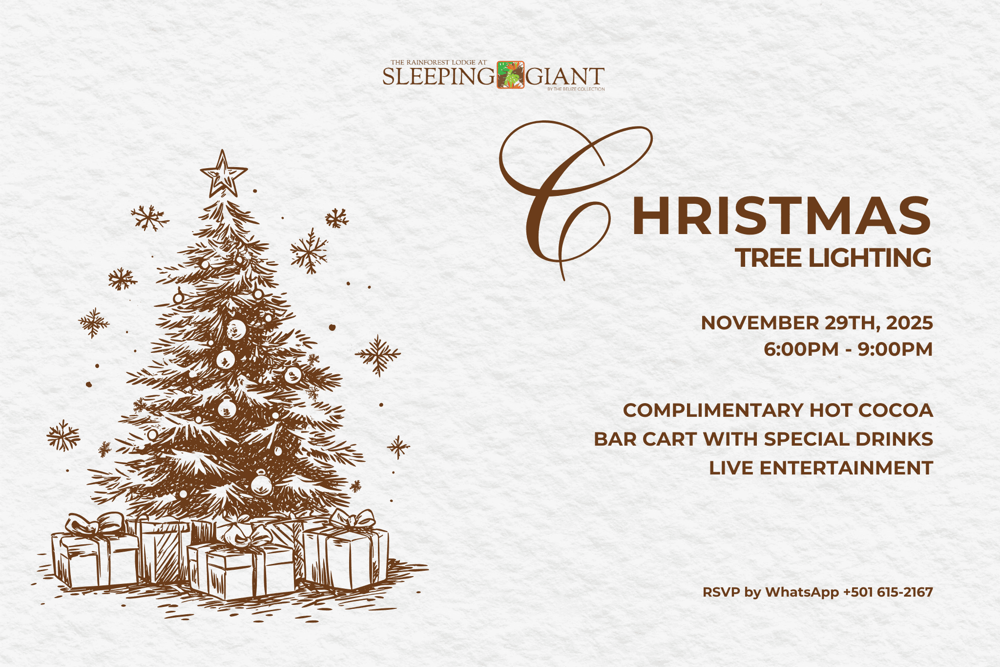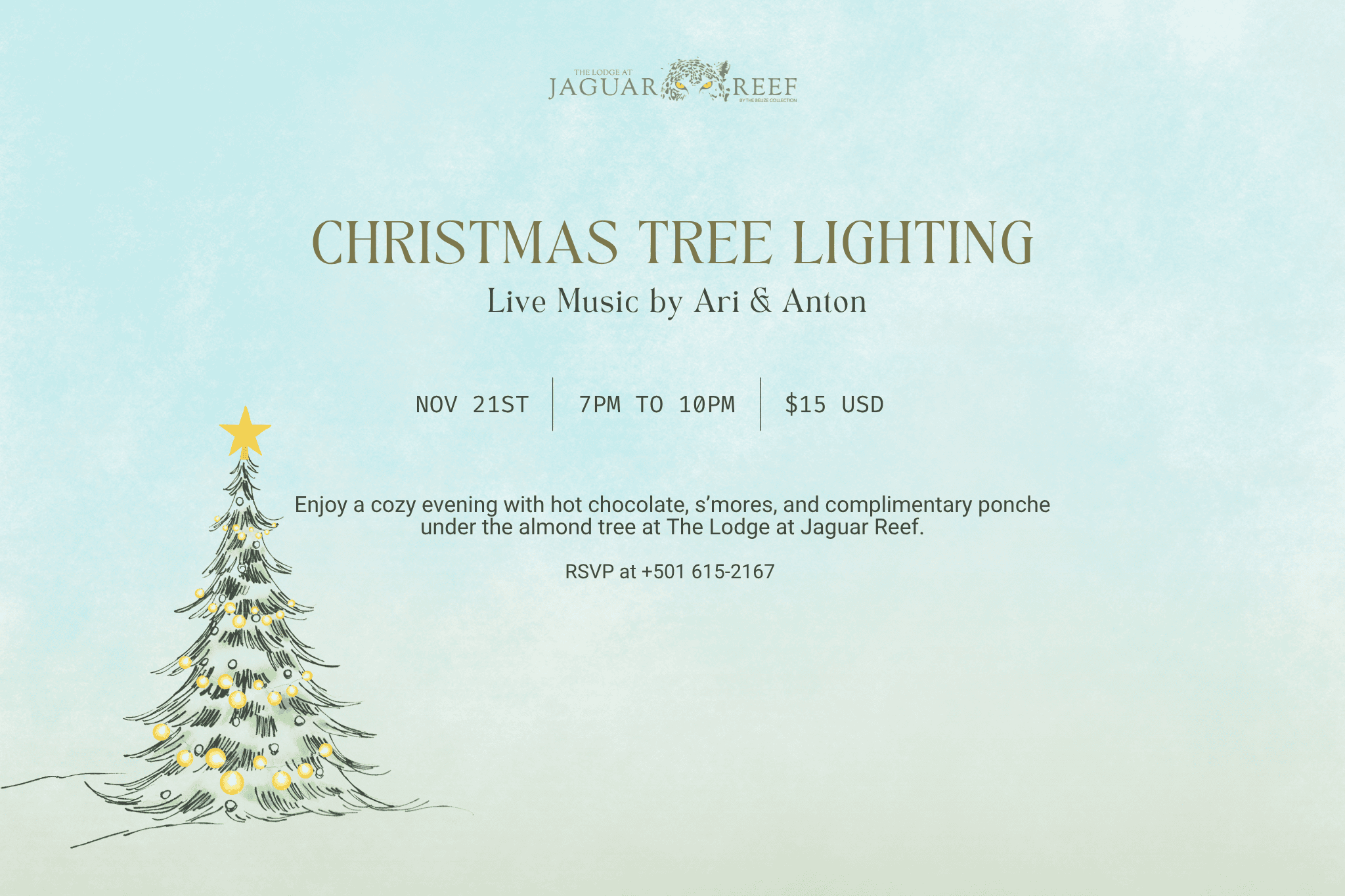 Encendido del árbol de Navidad en Jaguar Reef Celebre la magia de la temporada con luces centelleantes, cócteles festivos y ambiente navideño junto al mar, mientras nos reunimos para dar la bienvenida a la época más maravillosa del año. Envíenos un mensaje al +501 615-2167 p